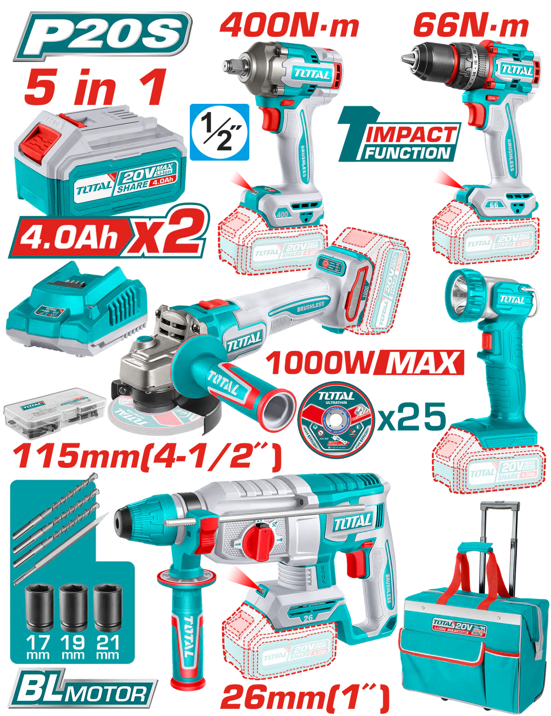 كومبو 20فولت 5قطع 2بطارية 4امبير هلتى وصاروخ توتال_TCKLI20592
